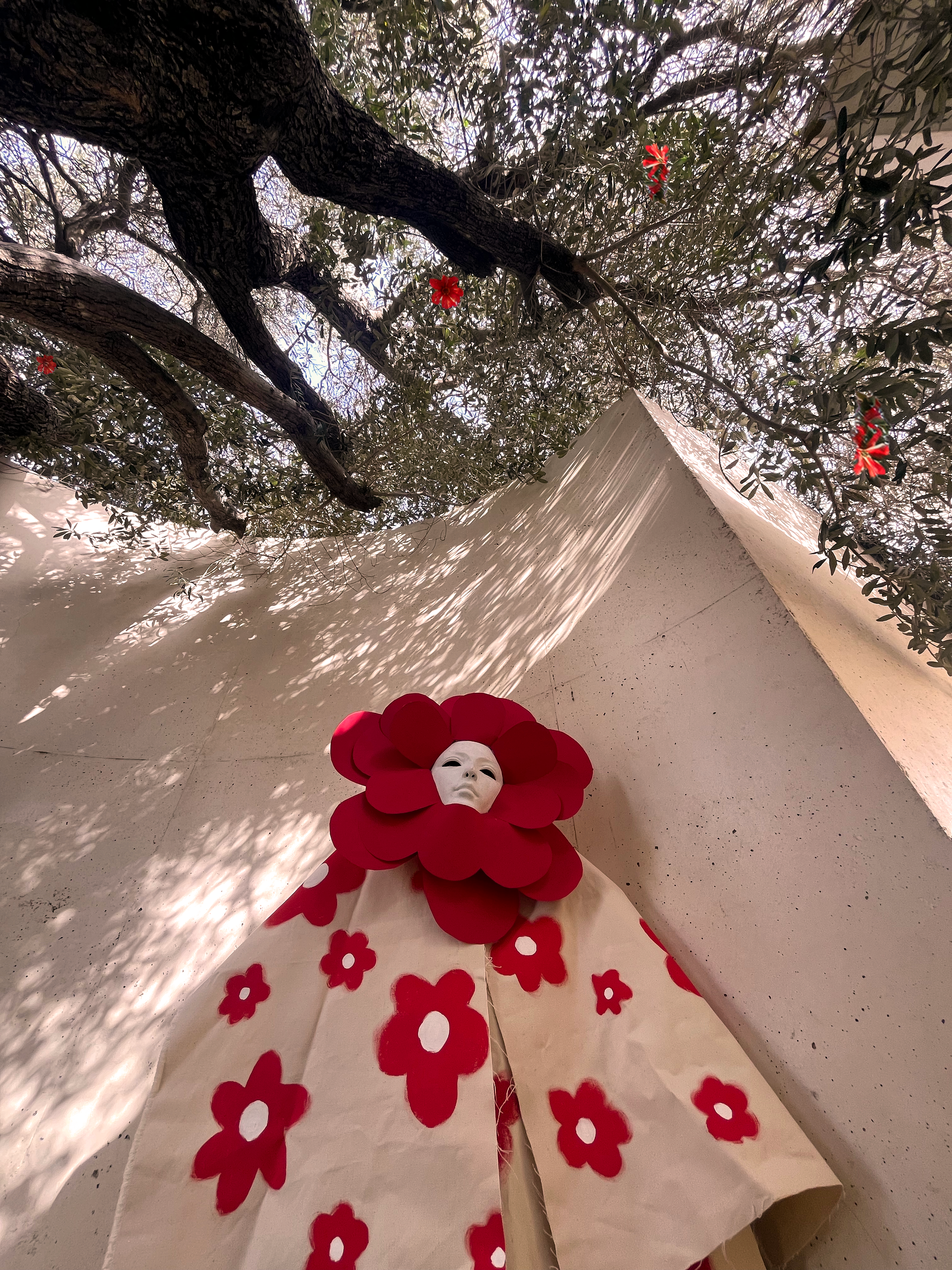 The Priestess’s dress and headdress were constructed from raw canvas fabric, hand-painted with floral motifs. The textile was developed as a continuous surface and then tailored into a long, flowing silhouette to create a ceremonial presence. The habit was crafted from the same painted canvas to maintain visual unity and echo religious attire through a contemporary lens.