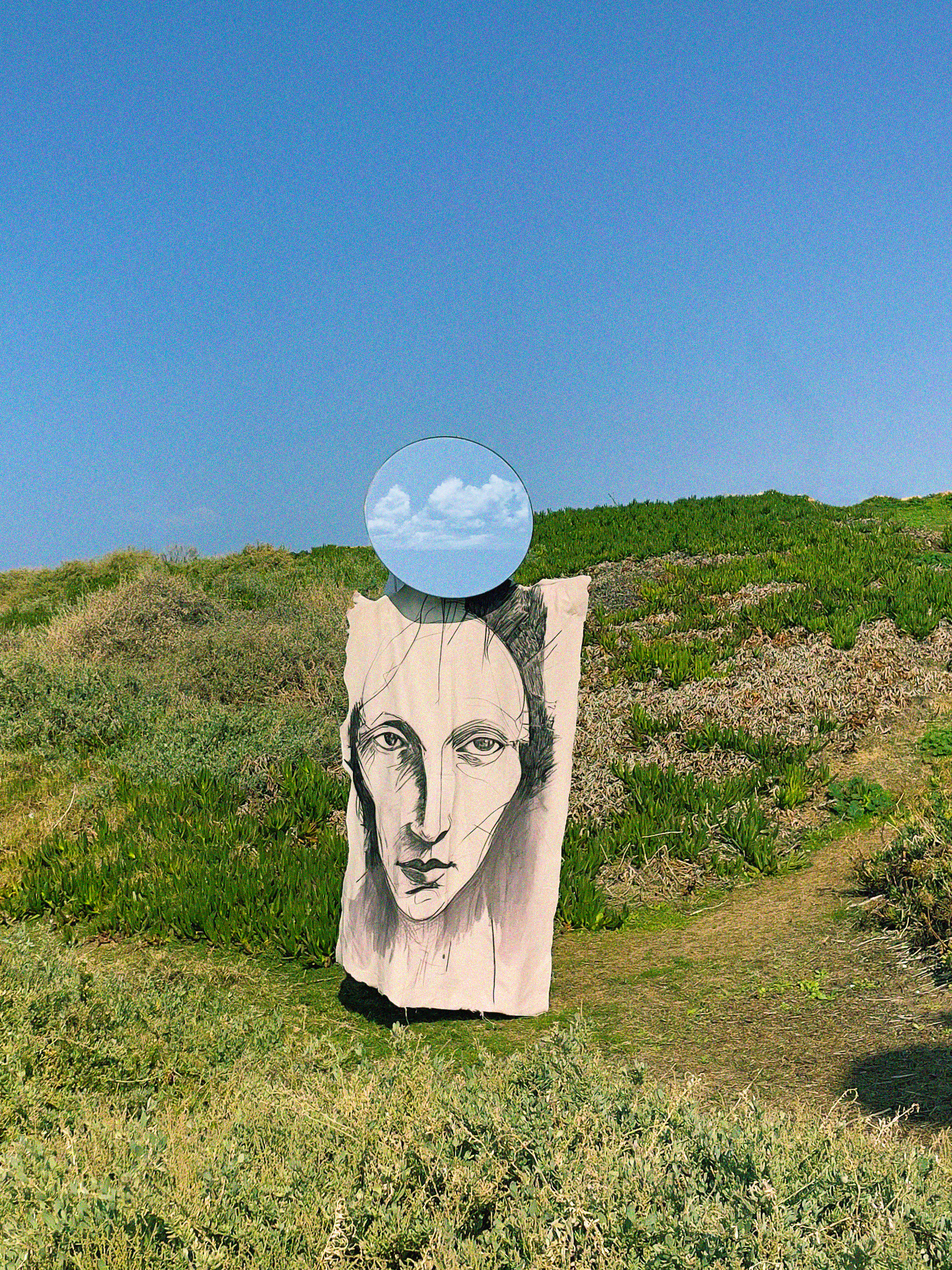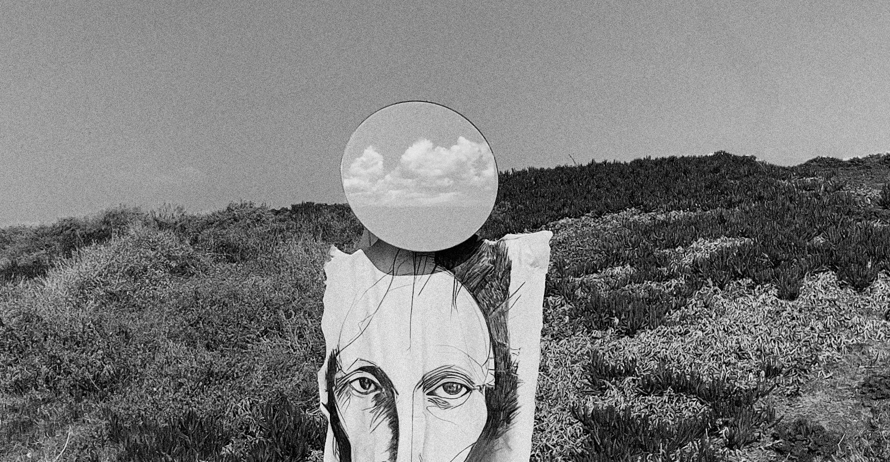 The mask is a circular mirror, used as both a physical and conceptual element. It reflects the viewer back into the piece, turning observation into participation and making the audience part of the character’s presence.